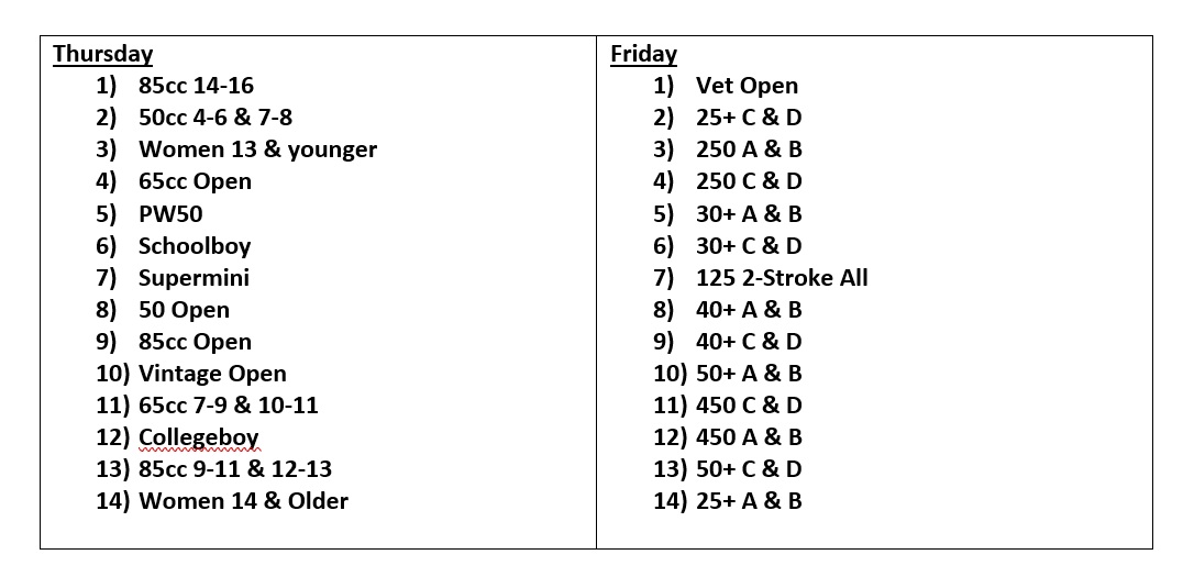 Thursday / Fridays Tentative Race Schedule – 2 Moto Format
